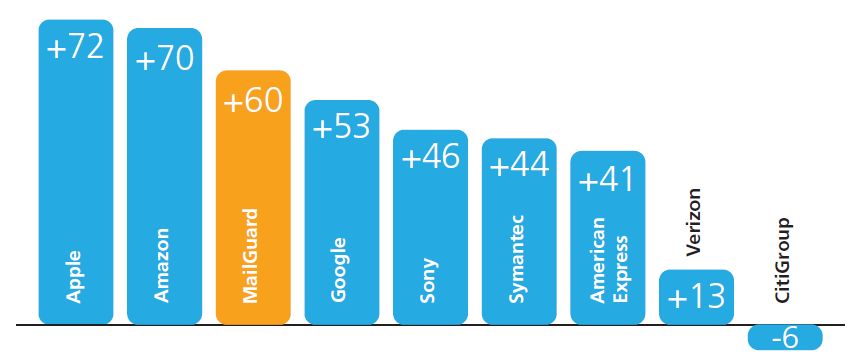MailGuard uses the Net Promoter Score (NPS). It’s the same customer loyalty metric used by Apple and GE. Our NPS shows that MailGuard is the security service most likely to be recommended to friends and colleagues (see below).